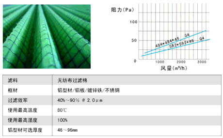 外框材質(zhì);鋁型材/鋁板折框/鍍鋅框/不銹鋼框/紙框、濾料材質(zhì)、合成纖維、護(hù)網(wǎng)材質(zhì)、鍍鋅電焊網(wǎng)/鋁網(wǎng)/不銹鋼網(wǎng)過(guò)濾效率 G1:40%@2.0μm,G2:65%@2.0μm, G3:85%@2.0μm, G4:90%@2.0μm使用最高溫度80℃,使用最高濕度100%。