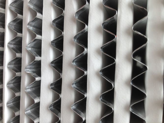 高溫高效過(guò)濾器濾材兩面180度翻折,形成鍥形褶層。高溫高效過(guò)濾器濾料折彎時(shí)有兩道壓痕,使其在隔板的尾端處形成鍥形盒式摺層,鍥形盒式褶層可以防止濾料破損。有些高溫高效過(guò)濾器生產(chǎn)商采用了單壓痕或滾痕式濾料褶層,甚至簡(jiǎn)單地人工折紙,在這種惰況下,濾料很容易被波紋形隔板尖銳的折頂損壞?;蛟谶^(guò)多搬運(yùn)過(guò)程中損壞濾紙。
